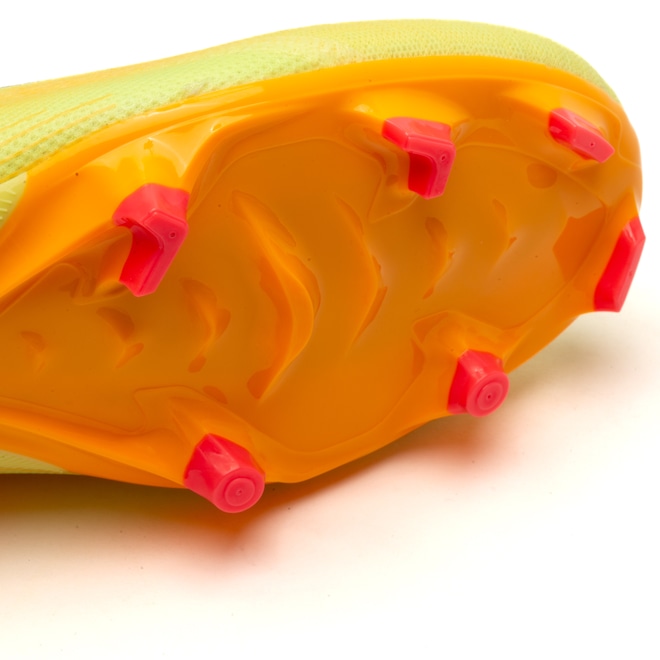 Sinta a tração explosiva do solado de TPU com travas altas e fixas, projetadas para aceleração máxima e mudanças rápidas de direção em campo.