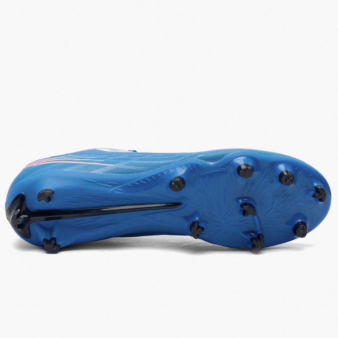 O solado com travas fixas garante tração firme nos gramados naturais, permitindo arrancadas explosivas.