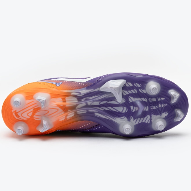 O solado em TPU com travas altas e fixas proporciona tração explosiva e estabilidade superior, permitindo movimentos ágeis e decisivos.