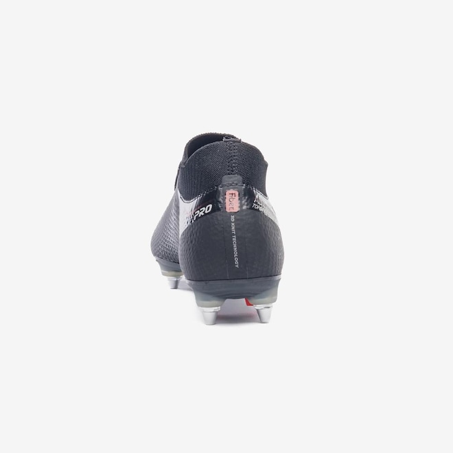 O solado desta chuteira é confeccionado em Pebax translúcido, um material que garante resistência e leveza. Com 13 travas mistas (cônicas e setas), sendo 6 removíveis de alumínio e as restantes com ponteiras em TPU, você terá a tração ideal em terrenos macios, permitindo que você se concentre no jogo e não nos seus pés.
