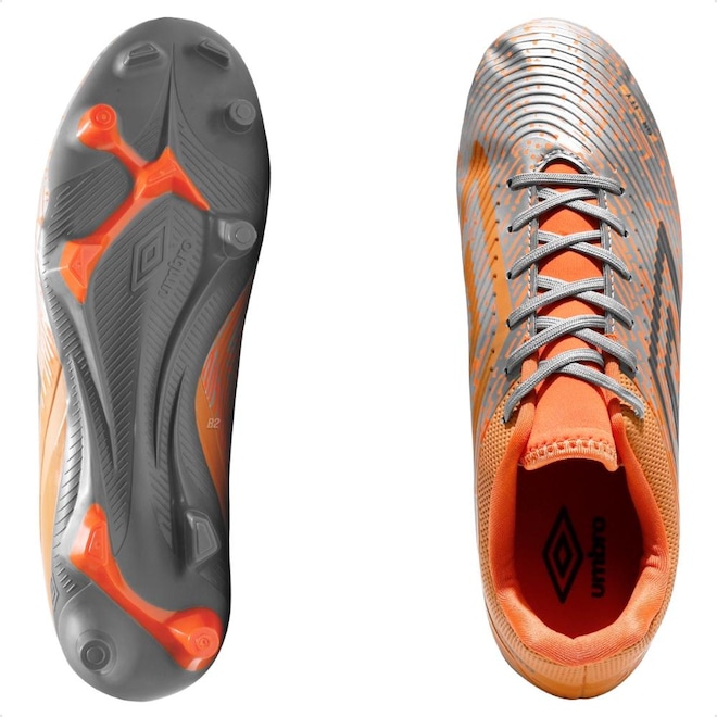 Possui língua em tecido com elastano que abraça o pé, serigrafia diferenciada em degradê com área em verniz para um contraste entre brilho e fosco, Diamante Umbro em destaque nas laterais e palmilha interna macia em EVA forrado.