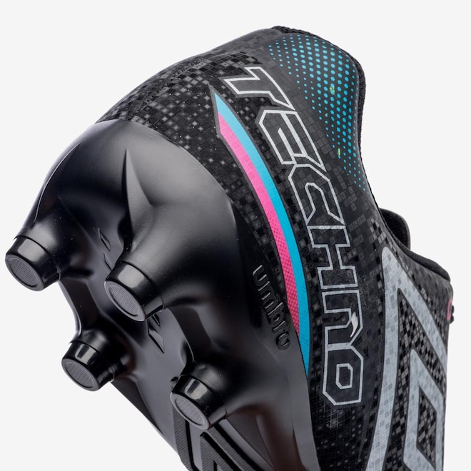 Com um cabedal laminado que apresenta um acabamento com efeito pixel, a chuteira se destaca pelo seu estilo moderno. Os contrastes entre as texturas foscas e brilhantes, juntamente com os grafismos em serigrafia e detalhes vibrantes, tornam a Umbro Techno II uma opção que chama a atenção em qualquer campo.