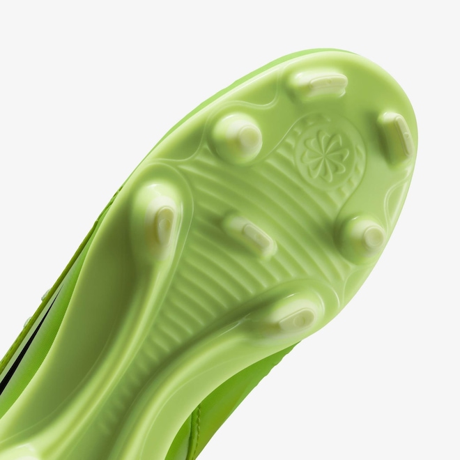 A parte de cima conta com um material maleável que se ajusta ao formato do pé, garantindo maior controle e proximidade com a bola.