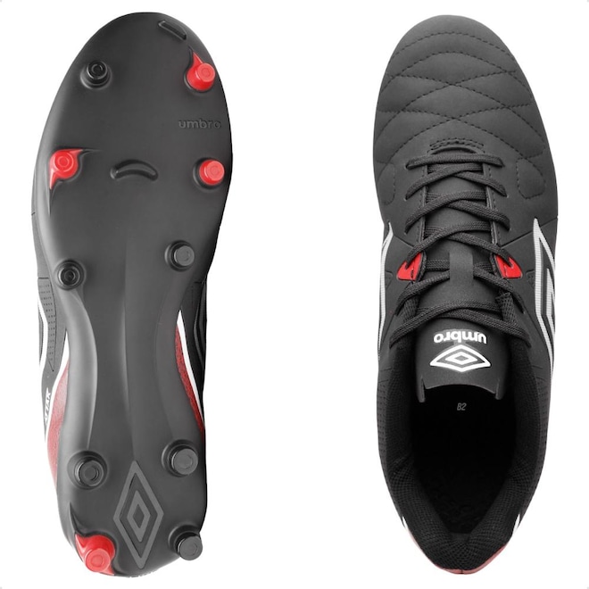 Seu cabedal é construído em material laminado, com aplique de alta frequência, detalhe diferenciado no Diamante Umbro e costura programada na parte frontal, preservando esse detalhe clássico e combinando com serigrafia e detalhe de textura gráfica.