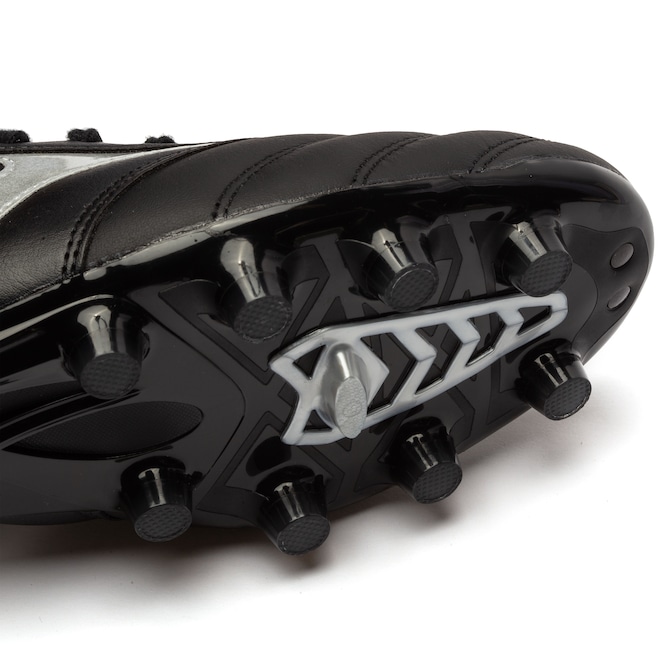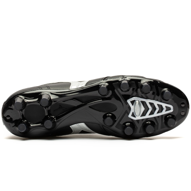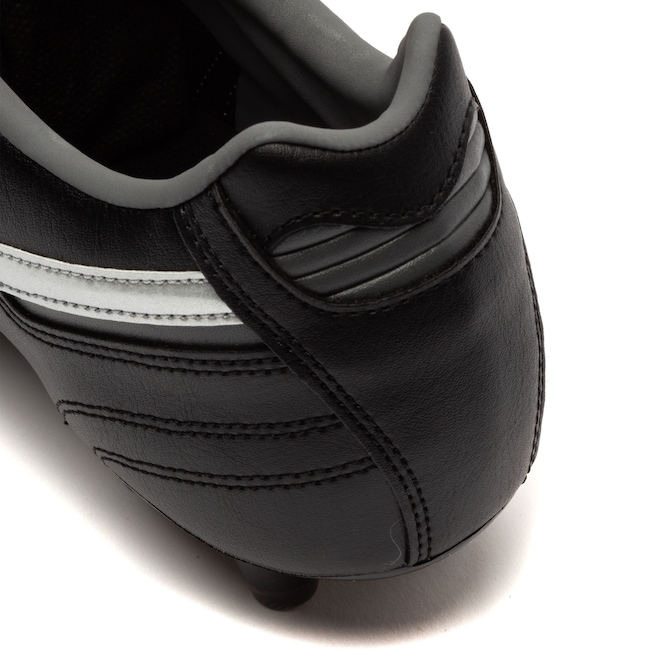 O cabedal sintético é leve e resistente, garantindo durabilidade mesmo nas partidas mais intensas. Já o solado em TPU com travas altas e fixas oferece excelente tração e estabilidade em terrenos naturais, potencializando sua performance. Para maior conforto, a palmilha forrada e o reforço acolchoado no calcanhar trabalham juntos para proteger seus pés durante todo o jogo.