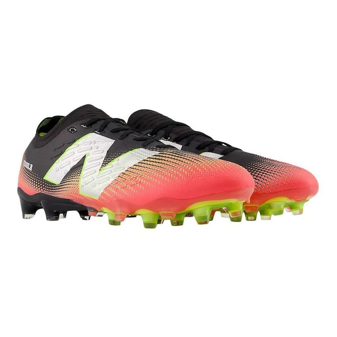 Solado: nylon leve com textura de saliências esféricas no antepé, desenhado para uso em piso firme (FG — Firm Ground).