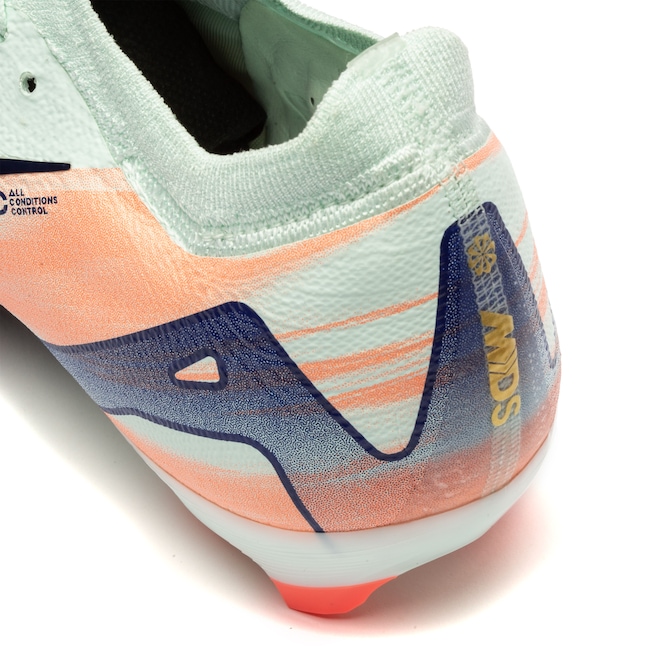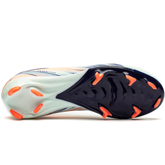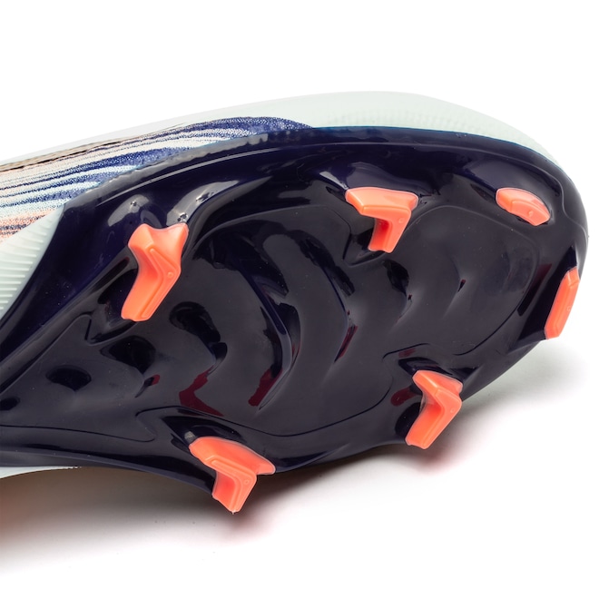 O solado em TPU com travas altas e fixas proporciona excelente tração, ideal para mudanças rápidas de direção e explosões de velocidade. O reforço acolchoado no calcanhar e a lingueta integrada garantem um ajuste mais firme e confortável, permitindo que você jogue sem desconfortos.