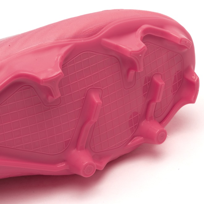 O cabedal é sintético, o solado em TPU e suas travas são altas e fixas.