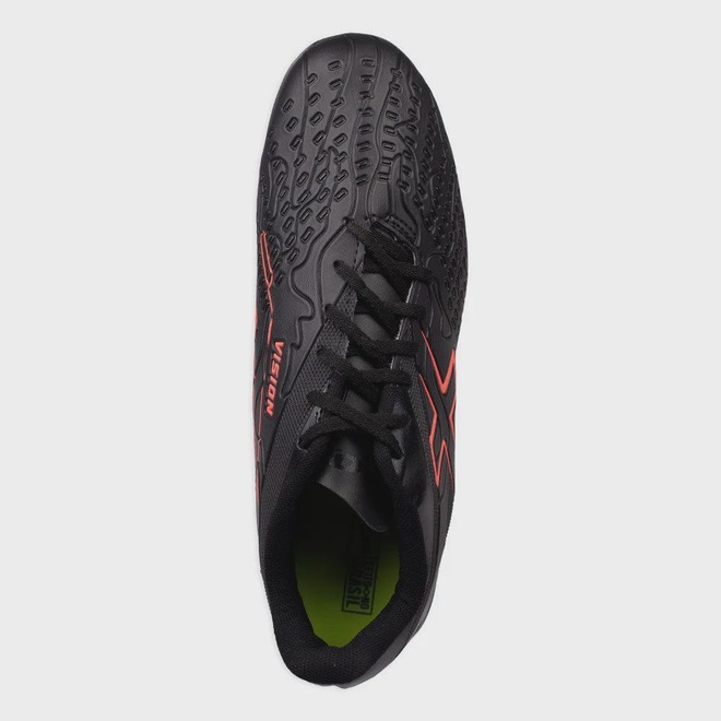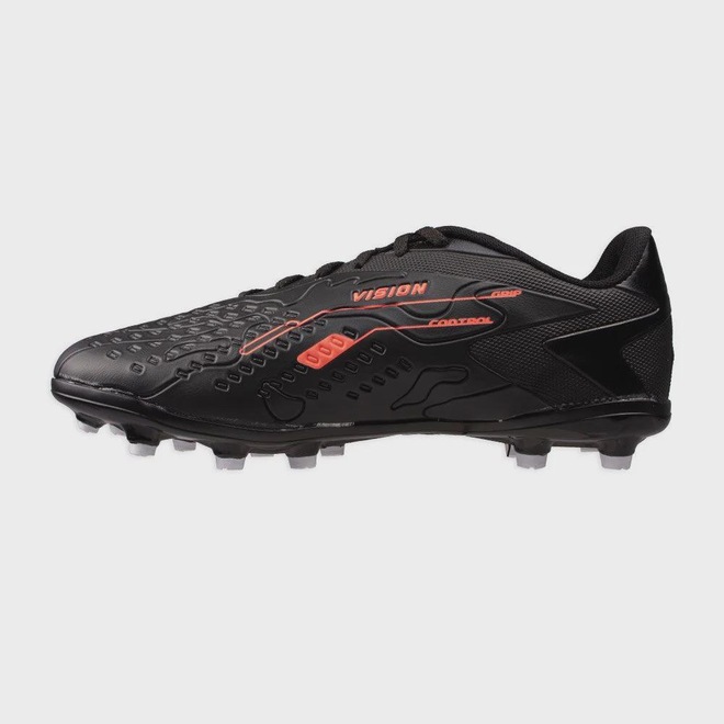 Para destaque nos jogos em campos de grama natural, a OXN oferece a chuteira Vision 2 Campo. Confeccionada em material sintético, o seu cabedal é resistente e protege os seus pés. O seu forro é têxtil e acolchoado para conforto durante as partidas e também evitar lesões. Seu solado fabricado em PVC com travas altas garantem resistência e firmeza ao pisar no gramado, evitando quedas. Por fim, o seu design é predominantemente na cor preta com detalhes em coral. Garanta já a sua OXN e mostre toda sua habilidade em campo!