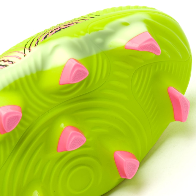 Seu solado inovador, com travas estrategicamente posicionadas, permite excelente tração tanto em campos de grama natural quanto artificial.