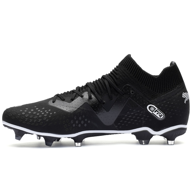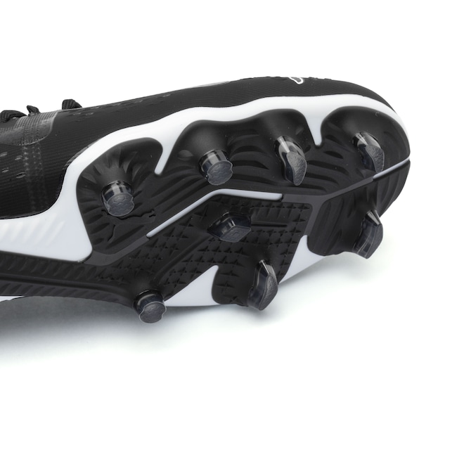 O solado com travas fixas em PU ajuda na adaptação do gramado natural.