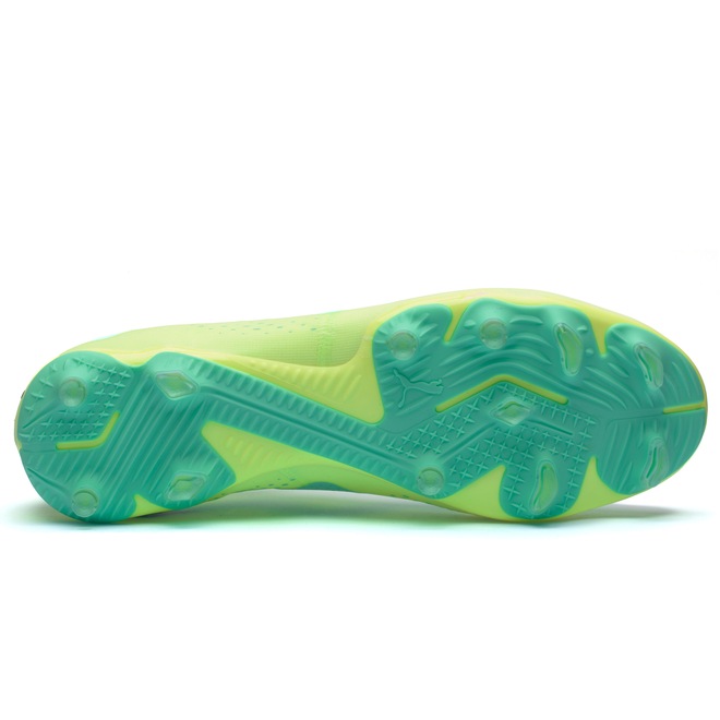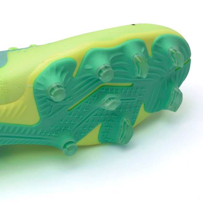 O solado com travas fixas em PU ajuda na adaptação do gramado natural.