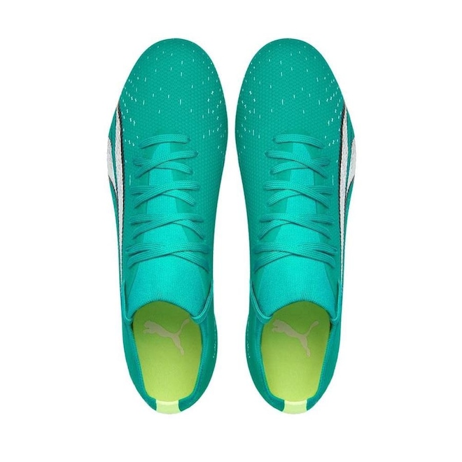 A chuteira de campo Puma conta com forro têxtil e reforço acolchoado no calcanhar garantindo maior proteção.
