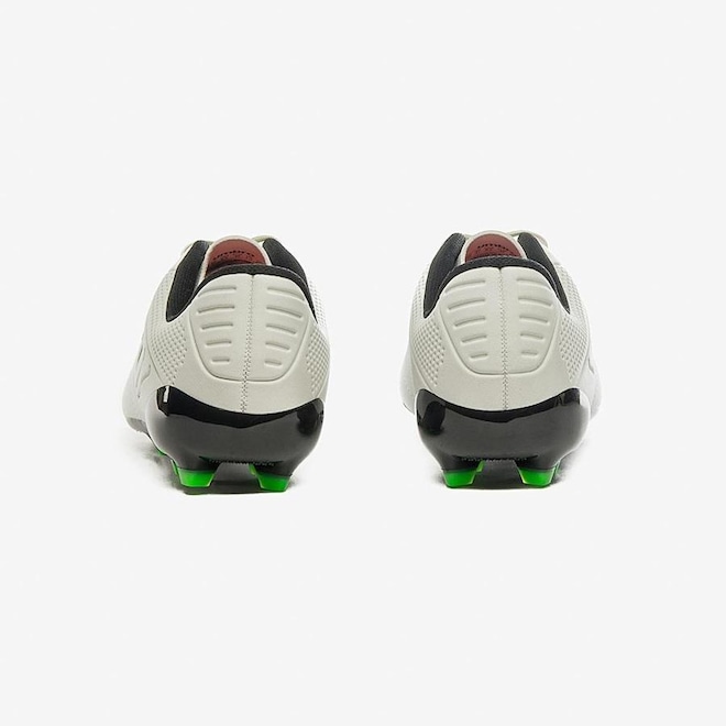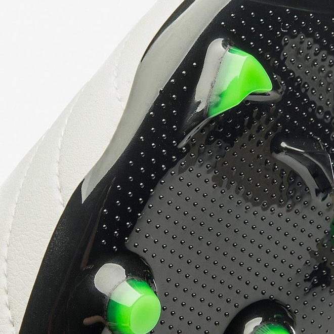O solado em TPU apresenta travas que permitem agilidade e aderência nos gramados.