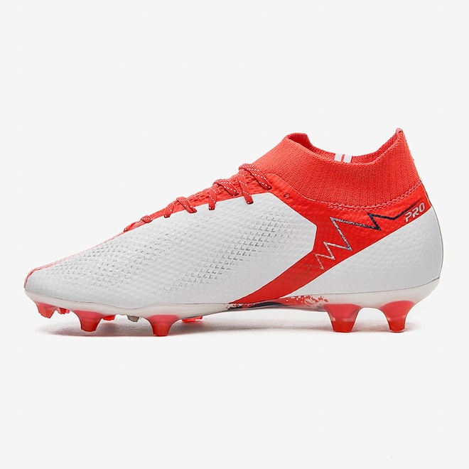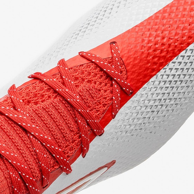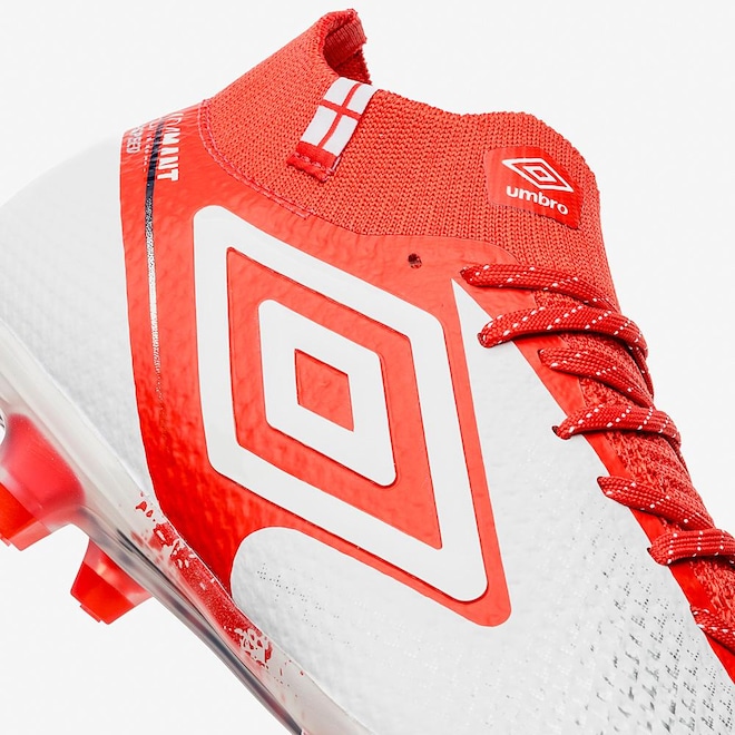 A Edição Especial English Pack resgata o DNA da Umbro em um visual icônico com detalhes estéticos e grafismos que se referem às cores da bandeira da Inglaterra, ao sangue dado por cada jogador em campo e às pinturas nos rostos dos torcedores. Modelo speed boot profissional, a Chuteira de Campo Umbro Adamant Top Speed Pro England proporciona leveza e maior sensibilidade no toque com a bola. Cabedal assimétrico slip-on confeccionado em estrutura de knit ultraleve combinada à tecnologia DIAMOND GRIP (textura 3D emborrachada para melhorar o grip e aumentar o tempo de contato com a bola) aplicada na parte frontal, áreas de reforço fusionadas e lâmina de TPU ultrafina de 0,35 mm. Possui meia de knit compressiva com cadarço para um calce mais fino, etiqueta bandeira da Inglaterra aplicada no talão e palmilha interna em EVA conformado com tecido forrado. O solado de campo FG é construído em estrutura de palmilha de montagem injetada em Pebax, que funciona como uma placa de retorno de energia e reforço na área do enfranque. Também conta com 11 travas mistas (cônicas e setas), ponteiras em TPU e tampografia Top Speed com grafismo tipo splatter na base.