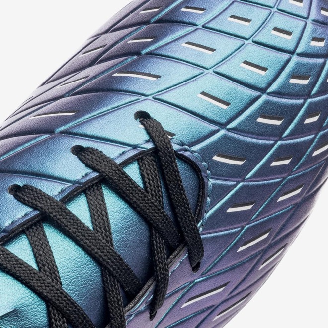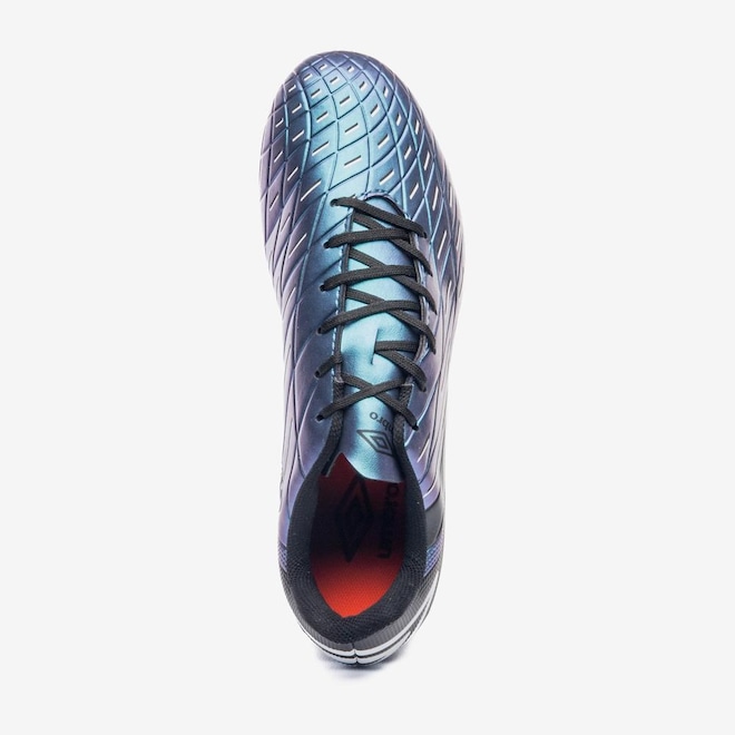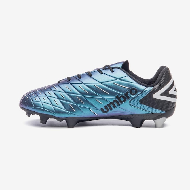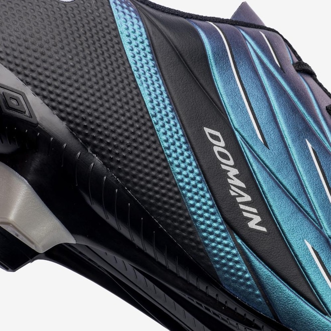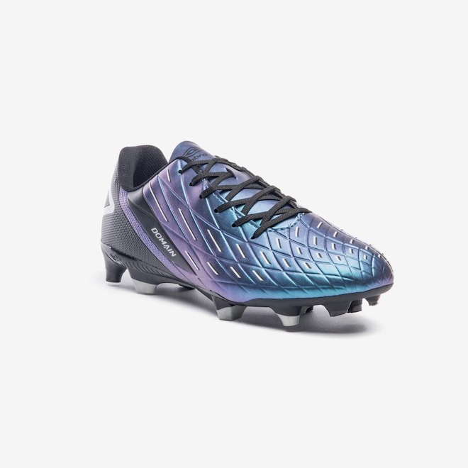 A Chuteira Campo Umbro Domain combina design contemporâneo e alta performance, ideal para jogadores ágeis de nível intermediário. O cabedal assimétrico em material laminado apresenta um efeito iridescente sobre a cor predominante, combinado a materiais que proporcionam um efeito camaleão, oferecendo um visual moderno e dinâmico. As linhas e áreas em alta frequência, combinadas com serigrafia em bloco de cor e tecnologia SY GRIP em tinta emborrachada, garantem um ajuste preciso e maior controle. A palmilha interna em EVA com tecido de poliéster proporciona maciez e conforto durante o jogo. O solado Stealth FG, com 10 travas altas bicolores e uma trava central de tração em TPU.