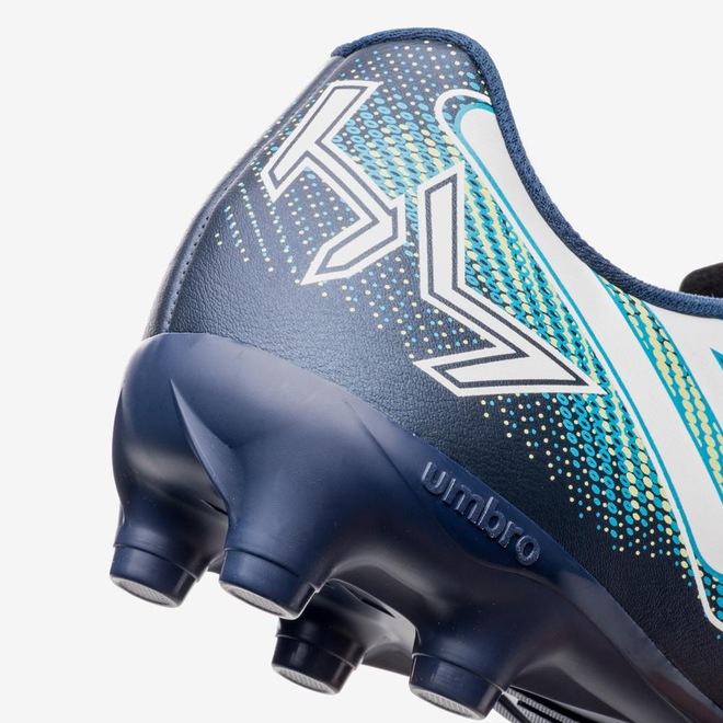 A Chuteira Campo Umbro Heatmap apresenta um design contemporâneo, com um grafismo que simula um mapa de calor, refletindo a intensidade e a paixão do jogo. O cabedal é confeccionado em material laminado, garantindo durabilidade e resistência, e possui uma aplicação de grafismo reticulado que agrega um toque de modernidade. O icônico Diamante Umbro centralizado e as inscrições "HM" na parte de trás complementam o visual arrojado.
