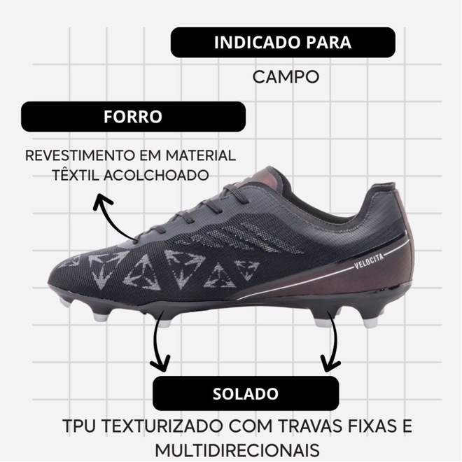 -Solado PVC: garante tração e estabilidade no campo, proporcionando uma jogabilidade ágil e precisa.