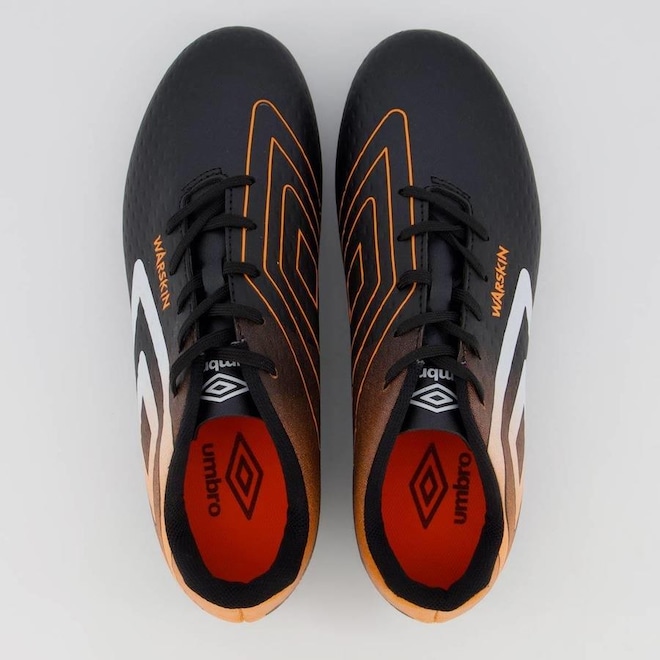 Chuteira de Campo Umbro Warskin Masculina A Chuteira de Campo Umbro Warskin Masculina foi especialmente projetada para atender às necessidades dos jogadores que buscam excelência e controle durante as partidas. Apresentando um design inovador e altamente funcional, o cabedal desta chuteira oferece um visual marcante com um padrão de degradê e uma textura única que utiliza um novo tipo de cilindro para garantir um grip aprimorado no momento do chute. Fabricado a partir de um material laminado com aplicação contínua em rolo em toda sua extensão, o cabedal exibe um grafismo em serigrafia em duas tonalidades, proporcionando um efeito degradê moderno e dinâmico. A assinatura Warskin é aplicada de forma elegante e discreta próxima ao atacador, enquanto o distintivo Diamante Umbro se destaca de maneira sutil ao longo da lateral, adicionando um toque de sofisticação ao design global da chuteira. A palmilha, feita de EVA macio com revestimento de poliéster, proporciona um apoio adicional e um conforto suave durante o uso. O solado de campo FG apresenta 14 travas estrategicamente posicionadas, com reforços costurados na parte frontal, tudo isso composto por PVC durável, garantindo aderência e estabilidade em diversos tipos de superfície. Informações:Ideal para: futebol de campo.Cabedal: em material sintético laminado. Fechamento: em cadarço para melhor ajuste aos pés.Solado: em borracha com travas fixas. Peso: 223g aproximadamente - número 39. O peso varia de acordo com a numeração. Garantia do Fabricante: 90 dias contra defeito de fabricação.ref: M129BV