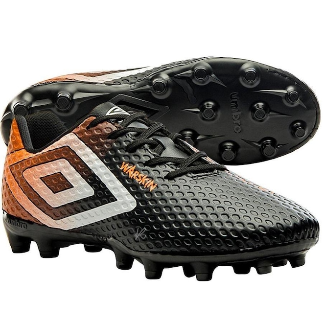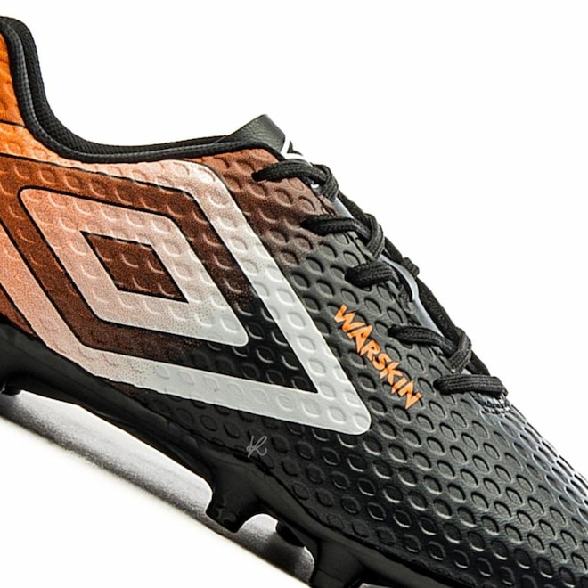 Chuteira de Campo Umbro Warskin Masculina A Chuteira de Campo Umbro Warskin Masculina foi especialmente projetada para atender às necessidades dos jogadores que buscam excelência e controle durante as partidas. Apresentando um design inovador e altamente funcional, o cabedal desta chuteira oferece um visual marcante com um padrão de degradê e uma textura única que utiliza um novo tipo de cilindro para garantir um grip aprimorado no momento do chute. Fabricado a partir de um material laminado com aplicação contínua em rolo em toda sua extensão, o cabedal exibe um grafismo em serigrafia em duas tonalidades, proporcionando um efeito degradê moderno e dinâmico. A assinatura Warskin é aplicada de forma elegante e discreta próxima ao atacador, enquanto o distintivo Diamante Umbro se destaca de maneira sutil ao longo da lateral, adicionando um toque de sofisticação ao design global da chuteira. A palmilha, feita de EVA macio com revestimento de poliéster, proporciona um apoio adicional e um conforto suave durante o uso. O solado de campo FG apresenta 14 travas estrategicamente posicionadas, com reforços costurados na parte frontal, tudo isso composto por PVC durável, garantindo aderência e estabilidade em diversos tipos de superfície. Informações:Ideal para: futebol de campo.Cabedal: em material sintético laminado. Fechamento: em cadarço para melhor ajuste aos pés.Solado: em borracha com travas fixas. Peso: 223g aproximadamente - número 39. O peso varia de acordo com a numeração. Garantia do Fabricante: 90 dias contra defeito de fabricação.ref: M129BV