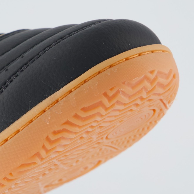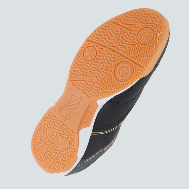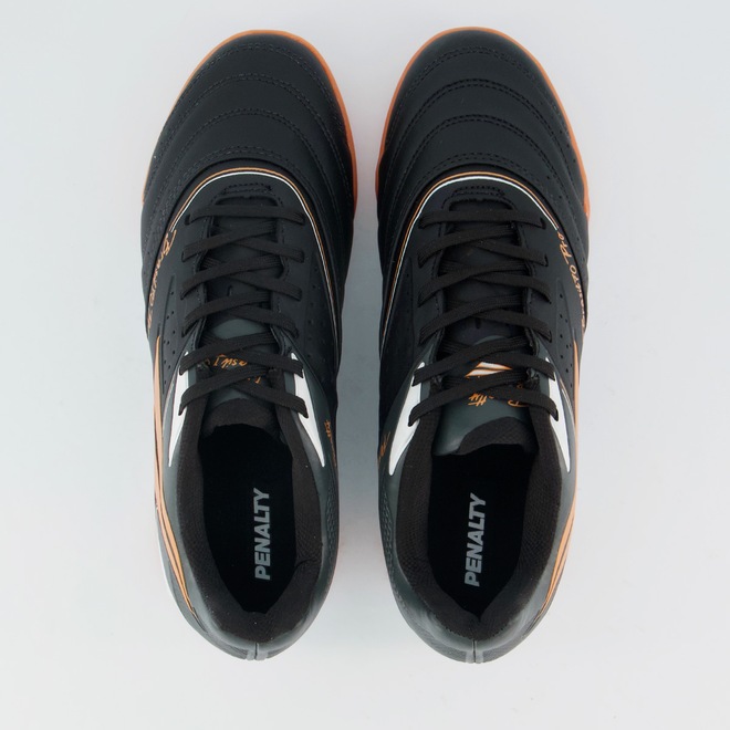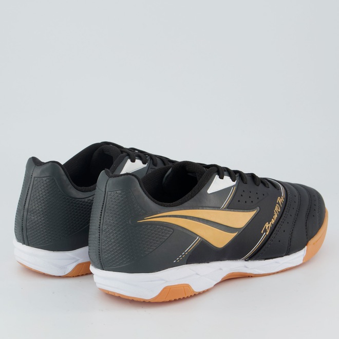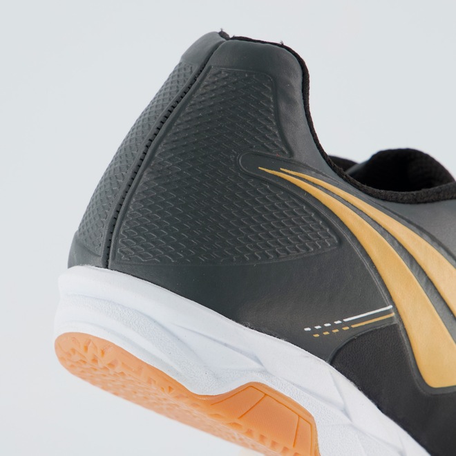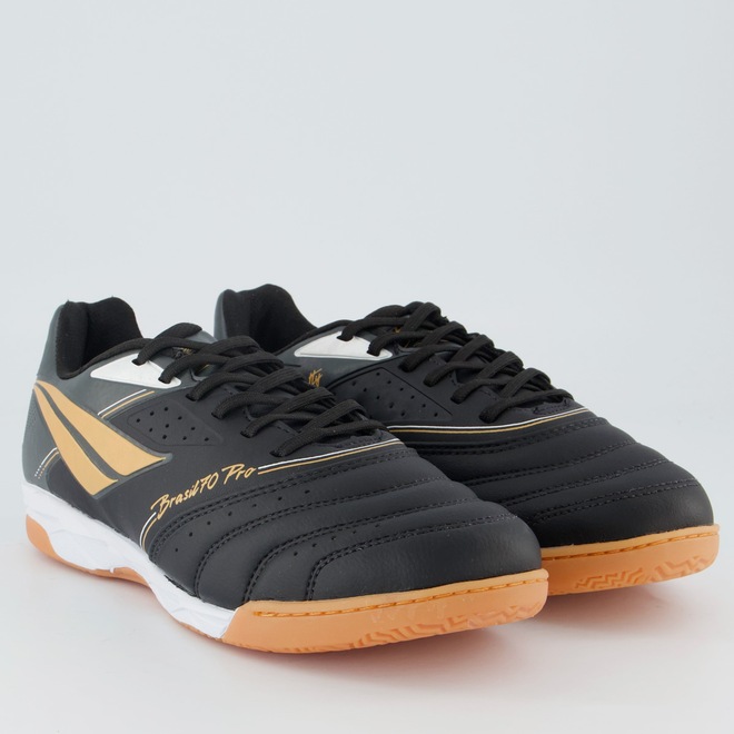 Composição cabedal (parte superior): Confeccionada em sintéticoPalmilha: EVA forrada e removível; facilita na higienizaçãoForro: Material têxtil com acolchoamento reforçadoSolado: PVC com travas altas e fixas, coladoLingueta: Fina e flexívelCor predominante: PretaIndicado para: FutsalGênero: MasculinoOrigem: NacionalAjuste: CadarçoPeso aproximado: 640g o par nº 40