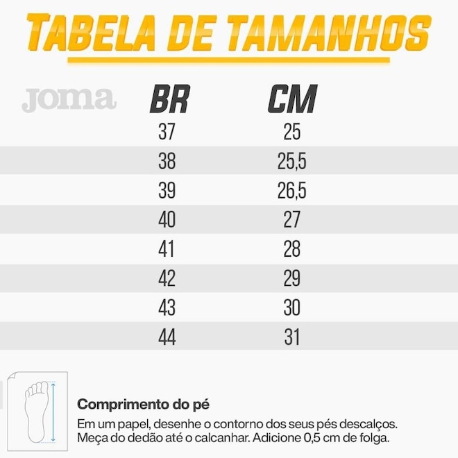 Reforço acolchoadoFaixa Etária Adulto Conteúdo da Embalagem 1 Par SAC do Fornecedor JOMA: contato@joma-sport.com.br Palmilha Forrada Garantia do Fornecedor Contra Defeito de Fabricação Nível Amador