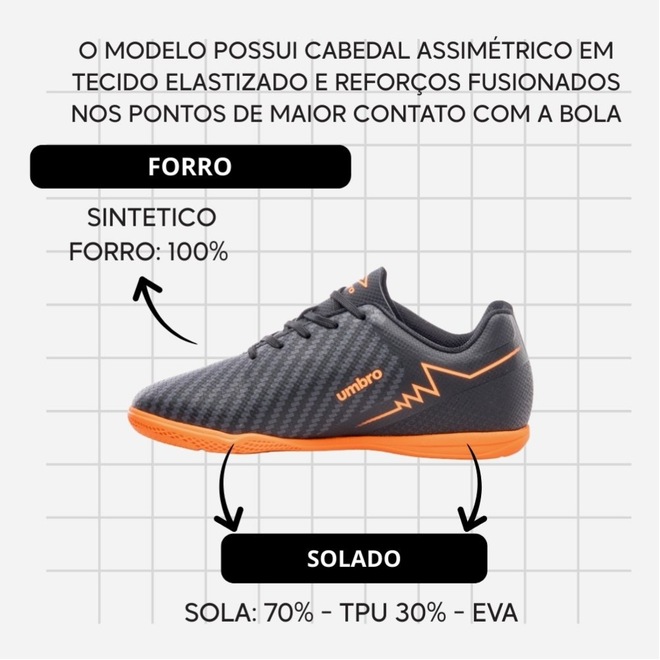 Cabedal: Laminado texturizado, proporciona controle e domínio de bola