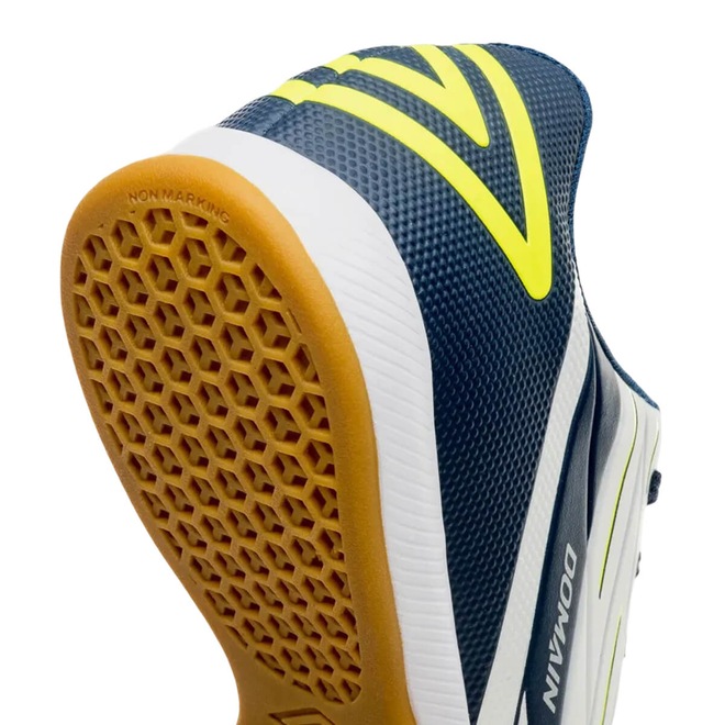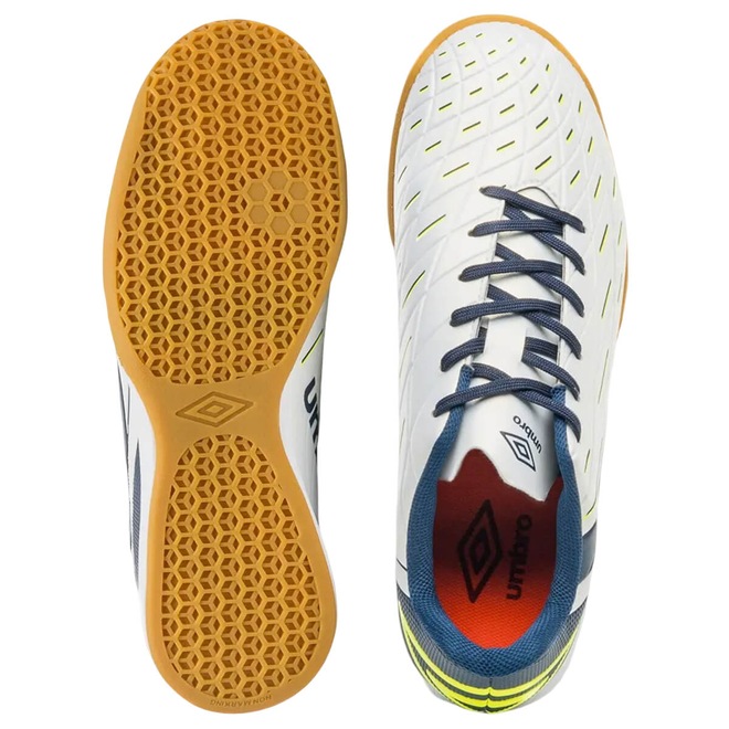 Com um design contemporâneo, a Chuteira Futsal Umbro Domain é indicada para jogadores ágeis de nível intermediário que buscam conforto e qualidade. O modelo combina materiais que resultam em um efeito camaleão. O cabedal assimétrico é construído em material laminado com efeito iridescente sobre a cor predominante, apresentando linhas e áreas em alta frequência combinadas com serigrafia em bloco de cor. A tecnologia SY GRIP, em tinta emborrachada, proporciona um grip superior. Possui palmilha interna em EVA forrada com tecido de poliéster, solado de futsal Hexa com entressola em EVA injetado e sola em borracha antiderrapante.