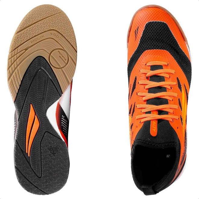 O solado em borracha antiderrapante com pontos de giro facilita a mobilidade e oferece tração eficiente nas quadras indoor, prevenindo escorregões e melhorando o desempenho.