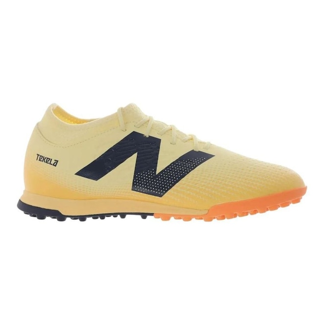 A Chuteira Society New Balance Tekela Magique TF V4+ Unissex foi desenvolvida para controle preciso e agilidade no gramado sintético: cabedal leve em material sintético com zonas têxteis garante ajuste seguro e toque limpo na bola, enquanto a placa TF com borracha e EVA entrega tração estável, respostas rápidas e conforto do início ao fim do jogo.