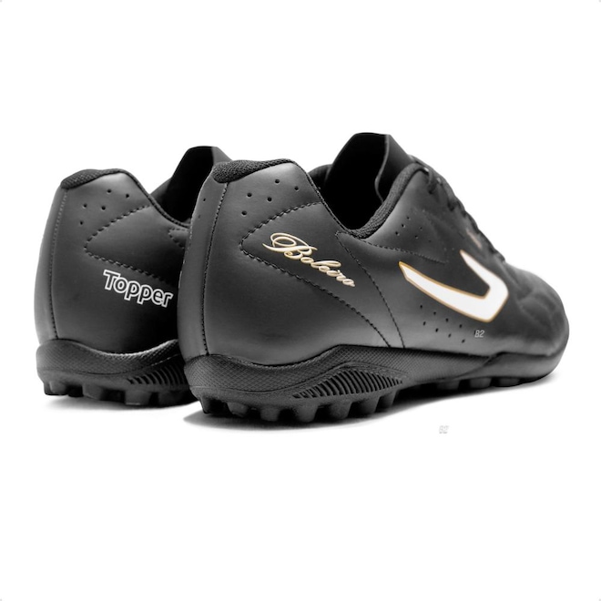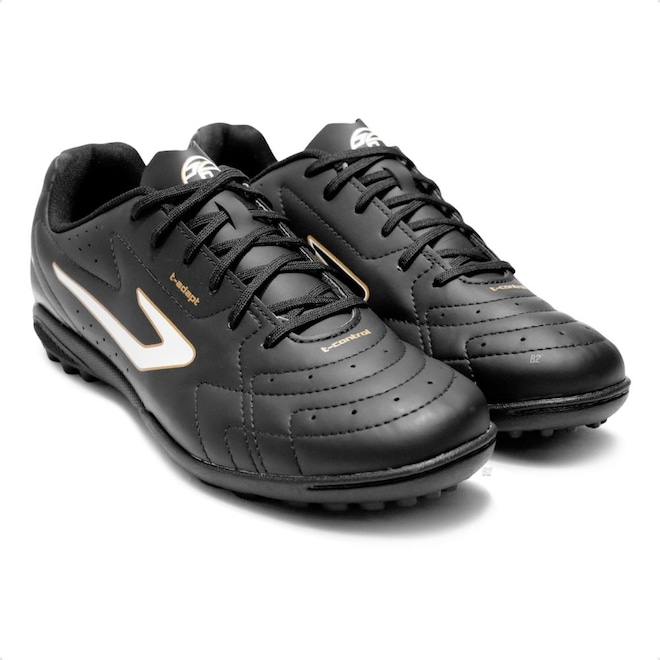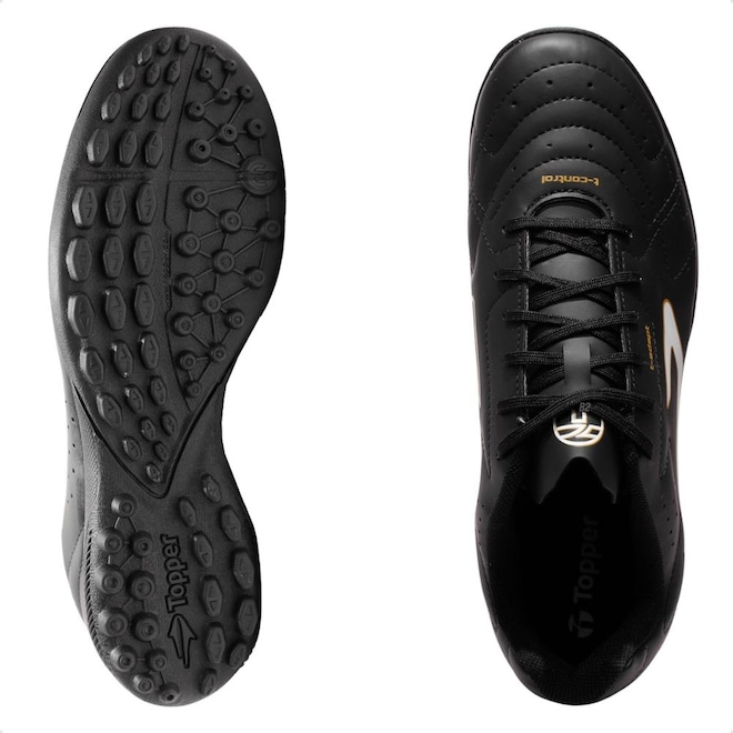 O solado de borracha conta com pequenas travas estrategicamente posicionadas, garantindo excelente aderência ao gramado artificiais.