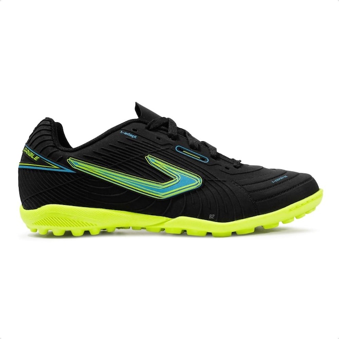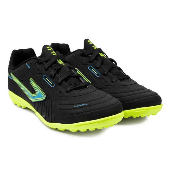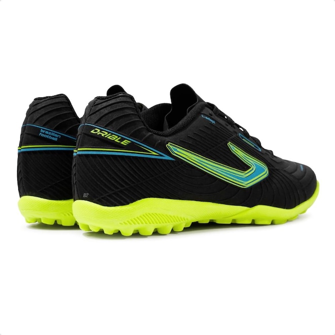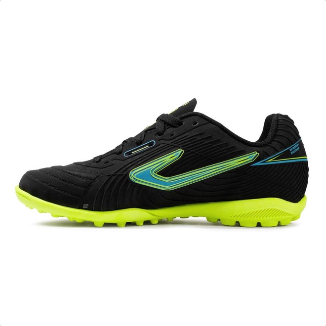 Com solado emborrachado e travas baixas e fixas, que garante estabilidade durante as jogadas em quadras de society.