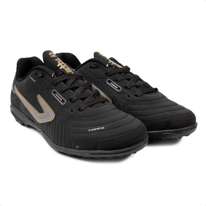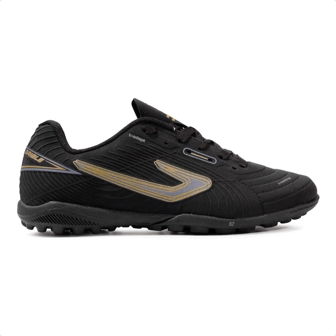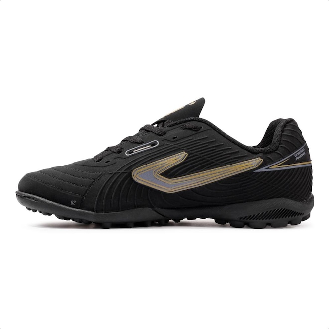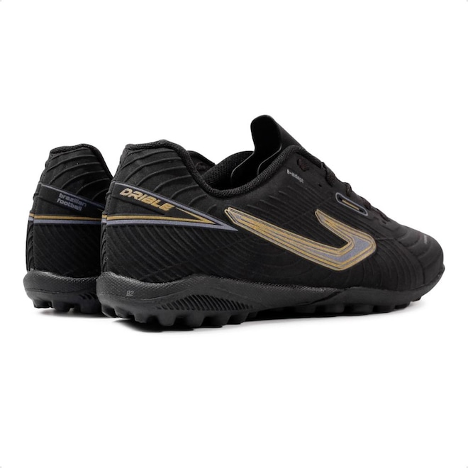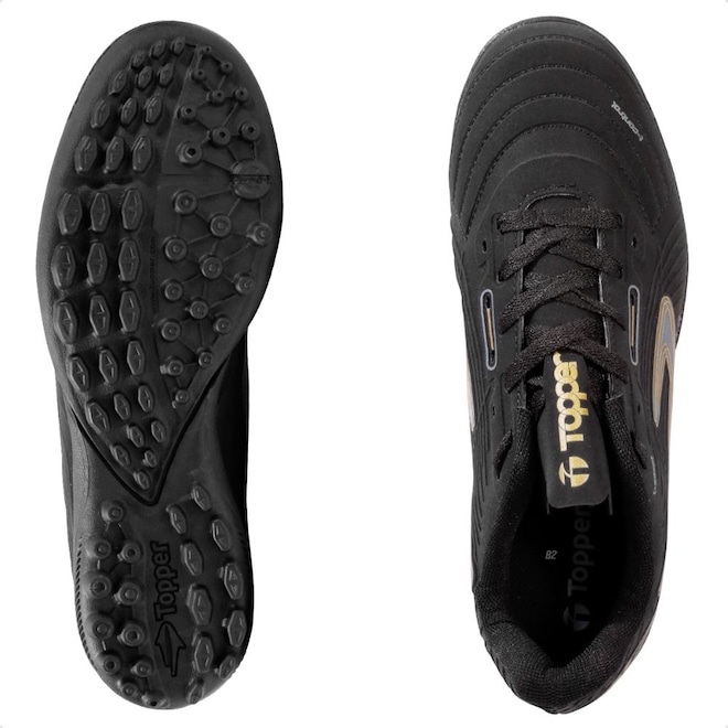 Com solado emborrachado e travas baixas e fixas, que garante estabilidade durante as jogadas em quadras de society.