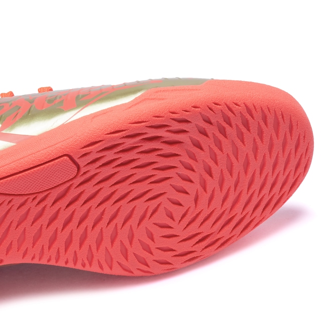 O Cabedal(Parte Superior do calçado) em material resistente, proporciona suporte e apoio dentro das quatro linhas.