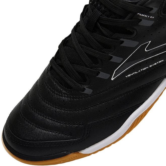 O cabedal é composto majoritariamente por material sintético, um material acessível que proporciona resistência e bom contato com a bola, ideal para iniciantes no futsal. Para melhorar a ventilação do suor, foram adicionadas pequenas perfurações com o sistema VTS.