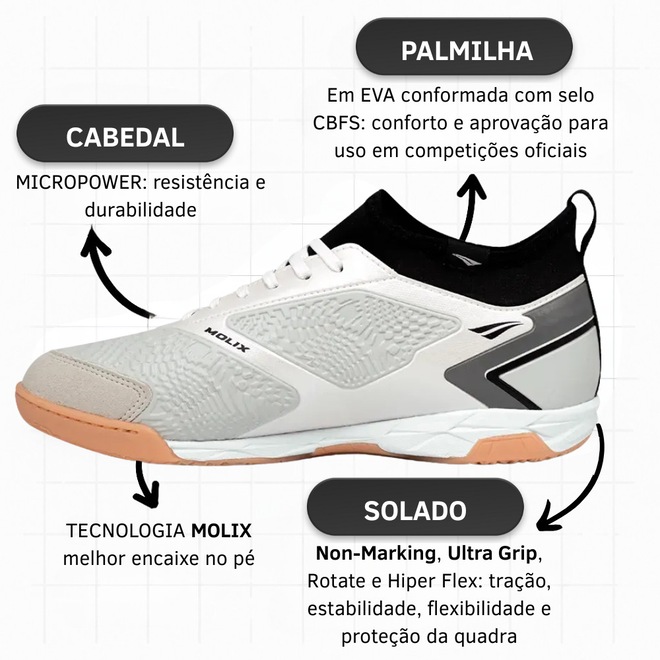 -Molix: tecnologia de cabedal para melhor encaixe e conforto ao pé.