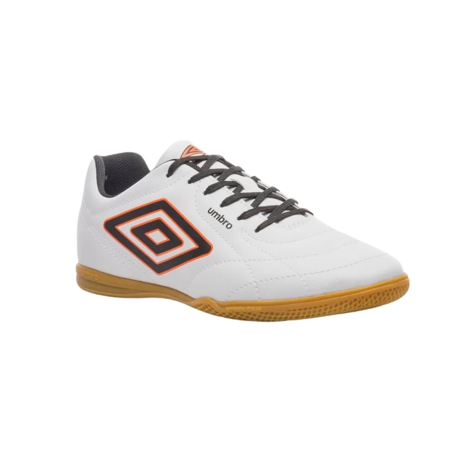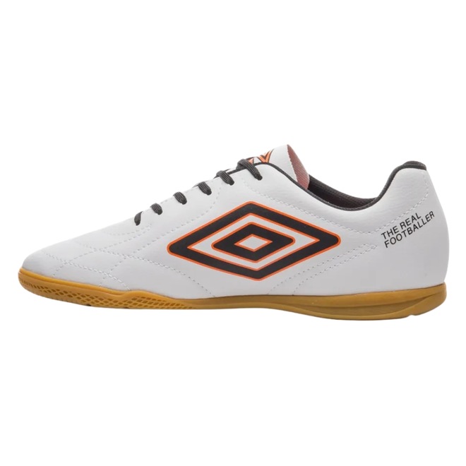 A Chuteira Futsal Umbro Class Footballer é indicada para jogadores de nível intermediário que buscam qualidade e conforto. O modelo apresenta cabedal confeccionado em material laminado com textura de couro relax, apresenta artes gráficas em serigrafia e costuras programadas em um desenho clássico. Possui palmilha interna em EVA forrada em tecido e solado de futebol indoor em borracha monocolor antiderrapante com tecnologia Hypergrip.