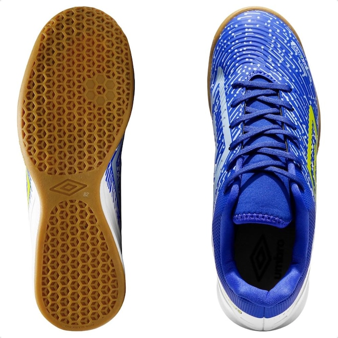 Possui língua em tecido com elastano que abraça o pé, serigrafia diferenciada em degradê com área em verniz para um contraste entre brilho e fosco, Diamante Umbro em destaque nas laterais e palmilha interna macia em EVA forrado.