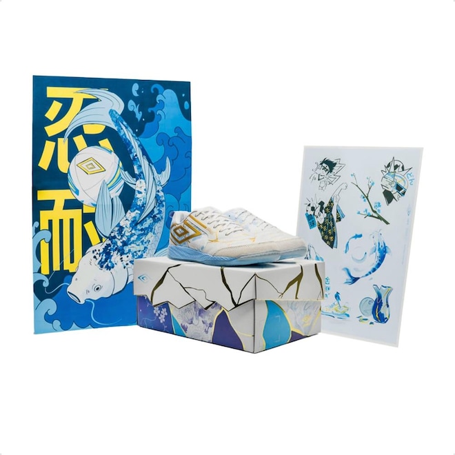 A Chuteira Futsal Umbro Pro 5 Bump Kintsugi traz um conceito exclusivo inspirado na técnica japonesa Kintsugi, que valoriza imperfeições com detalhes em dourado, simbolizando resistência, superação e autenticidade dentro das quadras.