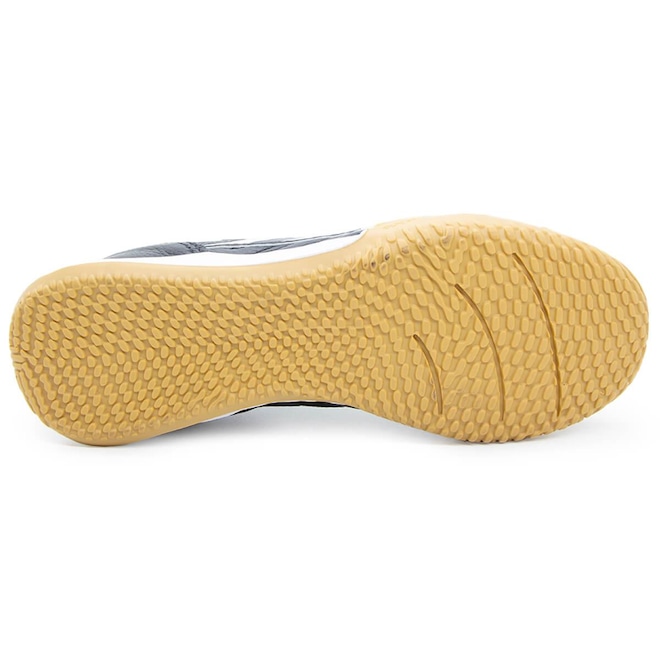 A sola da chuteira é especialmente projetada para oferecer excelente aderência e tração em ginásios, quadras e salões. Ela permite que os jogadores tenham movimentos ágeis, cortes precisos e mudanças de direção rápidas, proporcionando um bom controle e agilidade durante o jogo.