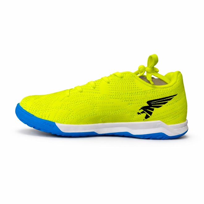 Com visual marcante na cor amarelo neon com detalhes em azul, a chuteira entrega estilo e performance dentro das quadras.