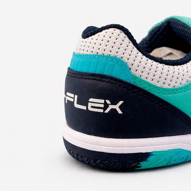 Com visual moderno na cor verde água com detalhes em branco e azul, a chuteira entrega estilo e performance para quem quer se destacar dentro das quadras.