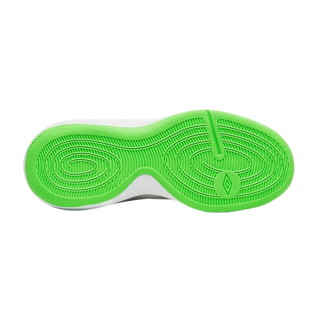 Segurança e Agilidade: O solado de borracha com propriedade antiderrapante oferece a tração ideal para movimentos rápidos e seguros em todas as superfícies de futsal, permitindo dribles e passes precisos.