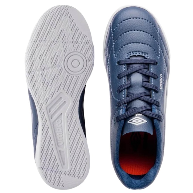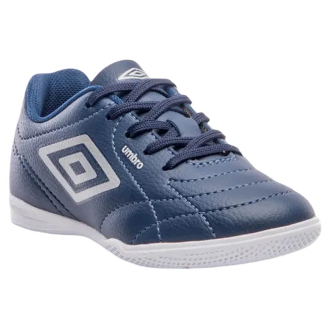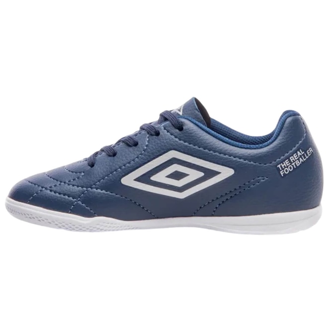 A Chuteira Futsal Umbro Class Footballer Jr é ideal para jovens jogadores que buscam qualidade e conforto, combinando design clássico com performance superior. O cabedal é em material laminado com textura de couro relax, artes gráficas em serigrafia e logo Diamante na lateral. A palmilha interna em EVA forrada garante conforto, e o solado de futebol indoor em borracha com Hypergrip oferece ótima aderência.