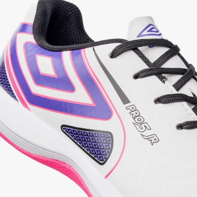 A Chuteira Futsal Umbro Pro 5 Jr combina conforto e qualidade para os jovens jogadores que buscam evolução nas quadras. O cabedal assimétrico em material laminado emborrachado conta com grafismo personalizado, sistema de lingueta tradicional e o autêntico Diamante Umbro aplicado em serigrafia na lateral. O solado de futsal possui entressola super macia em EVA de ponta a ponta e soleta em borracha antiderrapante, garantindo durabilidade e aderência. INFORMAÇÕES TÉCNICAS: CABEDAL: 100% SINTÉTICO FORRO/PALMILHA: 100% POLIÉSTER SOLA: 60% EVA 40% BORRACHA Medidas Aproximadas (Tamanho Palmilha): 30: 19,9 cm 31: 20,6 cm 32: 21,2 cm 33: 22,2 cm 34: 22,9 cm 35: 23,5 cm 36: 23,9 cm .
