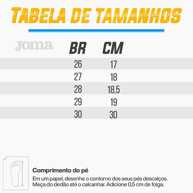 Reforço acolchoadoEstampa do Logo Estampado no Cabedal Garantia do Fornecedor Contra Defeito de Fabricação Conteúdo da Embalagem 1 Par SAC do Fornecedor JOMA: contato@joma-sport.com.br Nível Iniciante