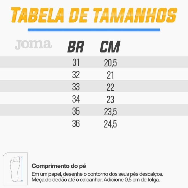 Reforço acolchoadoEstampa do Logo Estampado no Cabedal Garantia do Fornecedor Contra Defeito de Fabricação Conteúdo da Embalagem 1 Par SAC do Fornecedor JOMA: contato@joma-sport.com.br Nível Iniciante