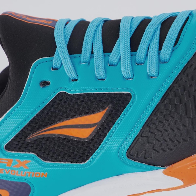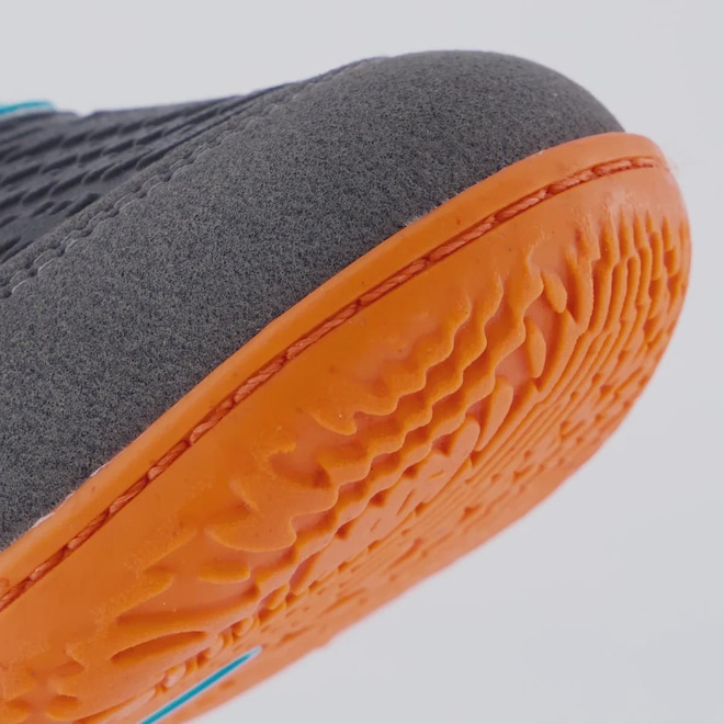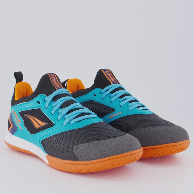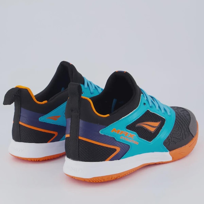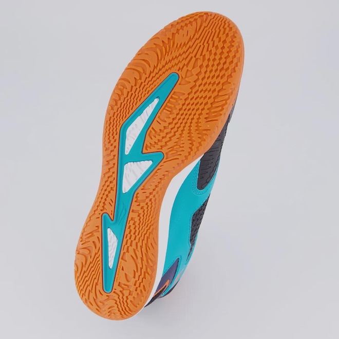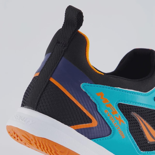 Tecnologias Neo Cushion: Tecnologia aplicada na entressola que a torna mais macia que as tradicionais de EVA, potencializando o amortecimento de impactos. Possui alta memória celular que proporciona maior resistência e rápida recuperação das características iniciais de amortecimento. Locker: "Bota" que permite ajuste mais anatômico e maior conforto. Rotate: Ponto de giro que auxilia a movimentação. Non-Marking: Uma borracha que não marca as quadras e proporciona excelente tração. Ultra Grip: Design que confere maior aderência para o solado, em todos os tipos de quadra. Molix 360: Exclusiva tecnologia que garante controle e domínio de bola durante o jogo. Composição cabedal (parte superior): Têxtil com sobreposição em sintético Palmilha: PU conformada e removível; facilita a higienização Solado: Emborrachado e antiderrapante Entressola: EVA macio e confortável Cor predominante: Preto Forro: Material têxtil Indicado para: Futsal Lingueta: Integrada Origem: Nacional Ajuste: Cadarço Peso aproximado: 650g o par nº 40