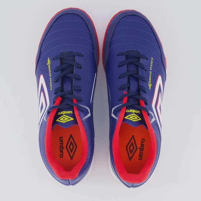 TecnologiasBreeze System: Tecnologia que melhora a ventilação do calçado, promovendo maior circulação de ar para manter os pés frescos e secos durante o uso.360 Zone: Sistema que oferece suporte e estabilidade em toda a volta do pé, garantindo melhor ajuste, controle e proteção em movimentos durante a prática esportiva.Non-Marking: Uma borracha que não marca a superfície e proporciona excelente tração.Composição cabedal (parte superior): Material sintéticoPalmilha: Em EVA e removível; facilita na higienizaçãoForro: Revestimento em material têxtil acolchoadoSolado: Borracha antiderrapante, coladoCor predominante: MarinhoLingueta: Fina e flexívelIndicado para: FutsalOrigem: NacionalAjuste: CadarçoPeso aproximado: 630g par nº 40