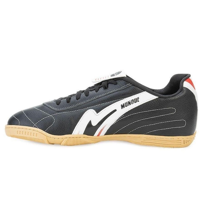 Nome: Chuteira Futsal Munique MN23-714. Gênero: Masculino. Indicado Para: Futebol-Dia a Dia-Treino e competição. Ocasião: Futsal. Material Externo: Em couro com costuras reforçadas. Material Interno: Têxtil. Fechamento: Cadarço. Palmilha: EVA forrada e removível. Solado: Em borracha específica para futebol de salão. Peso do Produto: 1.063 kg (o peso varia de acordo com a numeração). Garantia do Fabricante: Contra defeito de fabricação. Origem: Nacional. Código Produto: 01230687. Marca: Munique.ref: M105J3